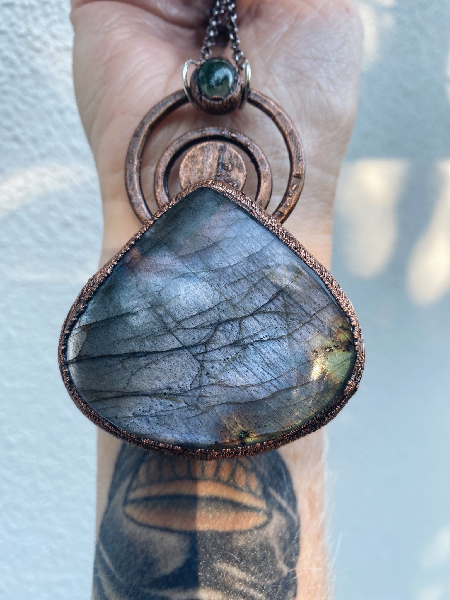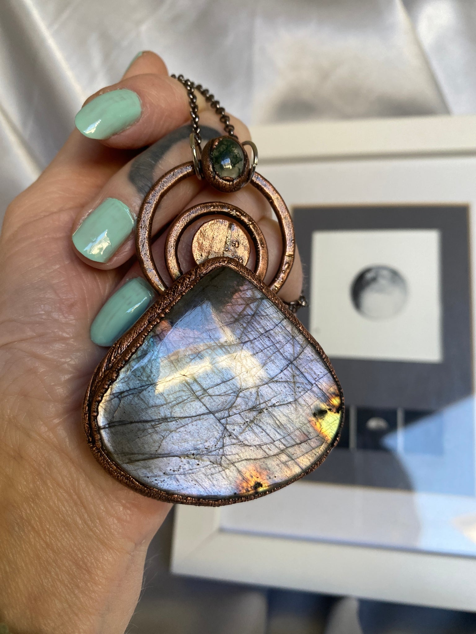 Lilac & Slate grey Labradorite Statement pendant with a jewel of Moss Agate